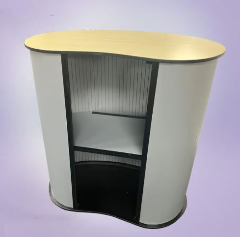 This Portable Curved Basic Exhibition Counter with Internal Shelf is a brilliant way to display and showcase your products in any exhibition, show room, trade show, supermarket, retail space, museum, office, reception area and many more! This counter has all the benefits of our basics curved counter but with the addition of a handy internal storage shelf, which is perfect for housing any extra stock, samples, or equipment you want to keep hidden and organised. Supplied with a standard grey wrap or with a full colour custom printed graphic to highlight your brand and promotional message. This counter is exceptional value and probably one of the least expensive printed exhibition counters available in the UK today. We have hundreds in stock, ready to support your exhibition and display needs. Plain counters are available for same day despatch if ordered before mid day - custom printed counters, please allow 3 working days from artwork approval for delivery