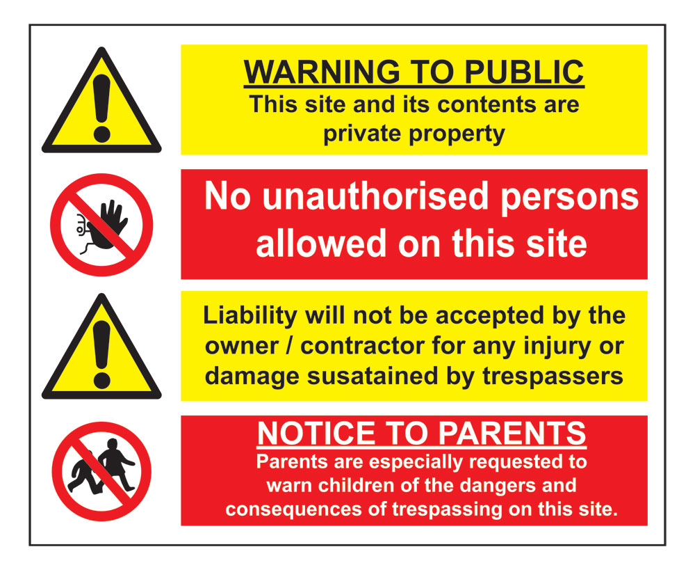 - Legal disclaimer in yellow: Liability will not be accepted by the owner or contractor for any injury or damage sustained by trespassers