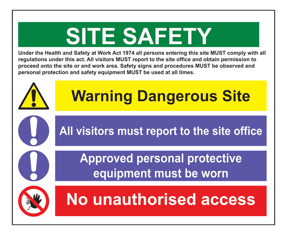 - Clearly displays four essential safety instructions: dangerous site working, visitor sign-in, PPE requirement, and no unauthorised access