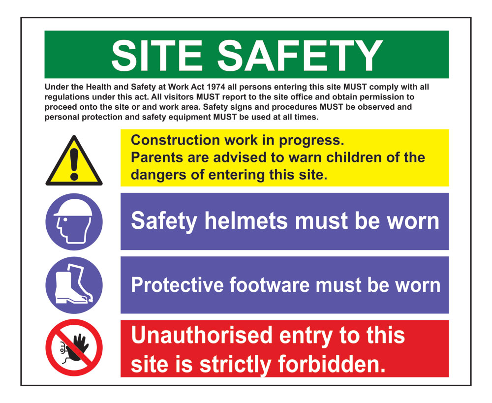 - Includes legal compliance text referencing the Health and Safety at Work Act 1974 to meet UK site regulations