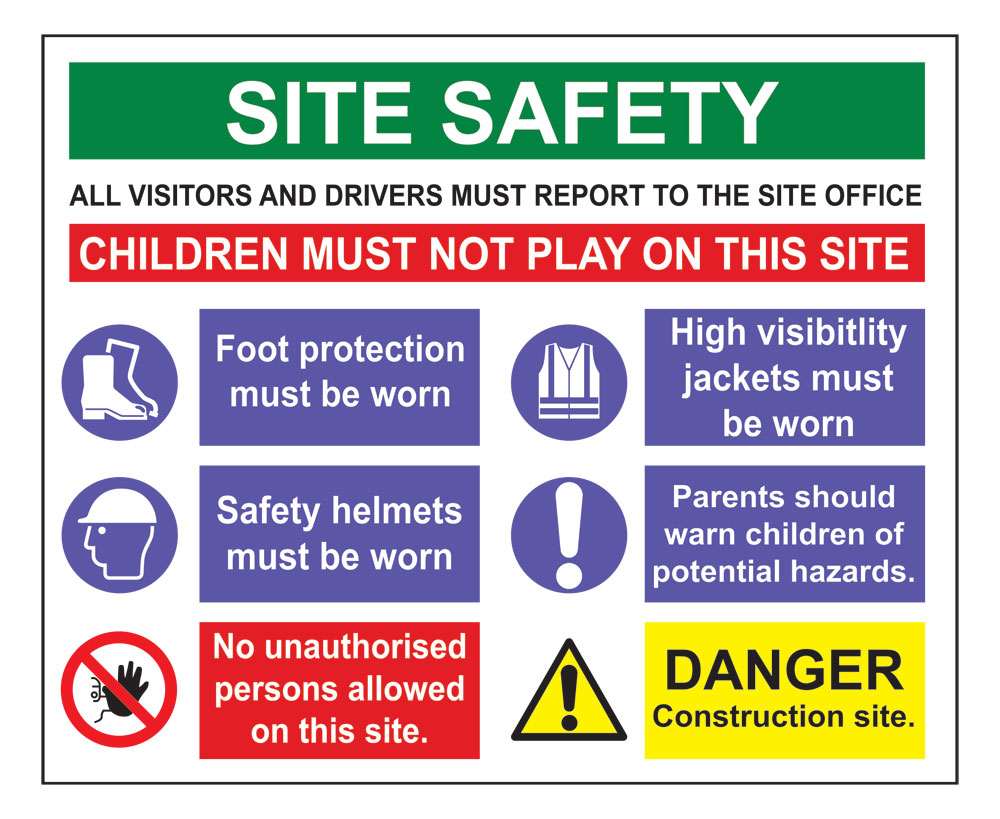 - Clearly display critical safety instructions including child safety, PPE requirements, restricted access, and visitor reporting